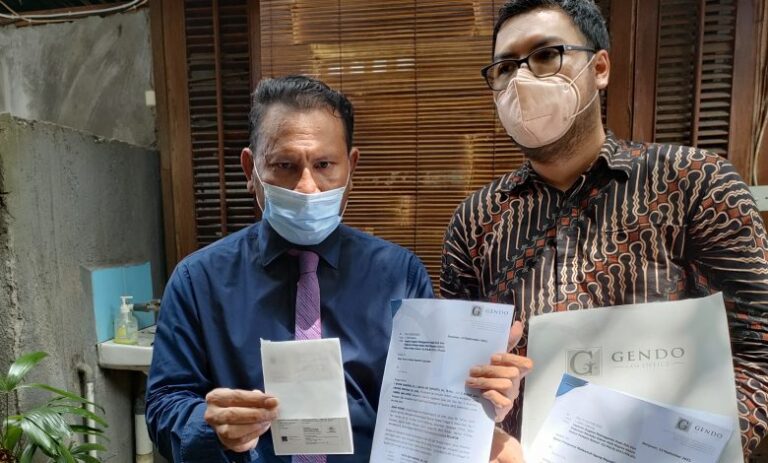 Caption: Wayan ‘Gendo’ Suardana dan rekan pengacara Gendo Law Office menunjukkan surat pelaporan tiga majelis hakim di PN Gianyar ke KY dan Badan Pengawas MA, di Denpasar, Senin (13/09/2021). Gendo Laporkan Tiga Majelis Hakim PN